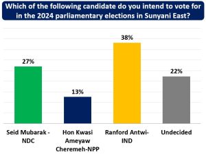 ❑ In Sunyani East, an independent candidate, Ransford Antwi, has taken a strong lead as he polled 38% of the votes. Seid Mubarak, NDC, is in second place with 27% of the votes while Hon. Kwesi Ameyaw Cheremeh is in third place with 13% and 22% are undecided. The poll also shows that 14% of Hon Cheremeh’s 2020 voters intend to vote for Seid Mubarak, NDC, 45% will vote for Ransford Antwi, the independent candidate. Only 14% of his voters indicated they intend to vote for him again while 20% are undecided and 5% will not vote.