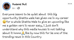 Kwame Nut took to social media to vent his disappointment, stating that it’s not every day that a legend like Shatta Wale gives an upcoming artist a chance to shine.