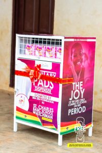 Therefore, the first dispenser has been launched and donated to St. Charles Basic School in Watchman, Sunyani, providing free sanitary pads to girls who cannot afford them.
